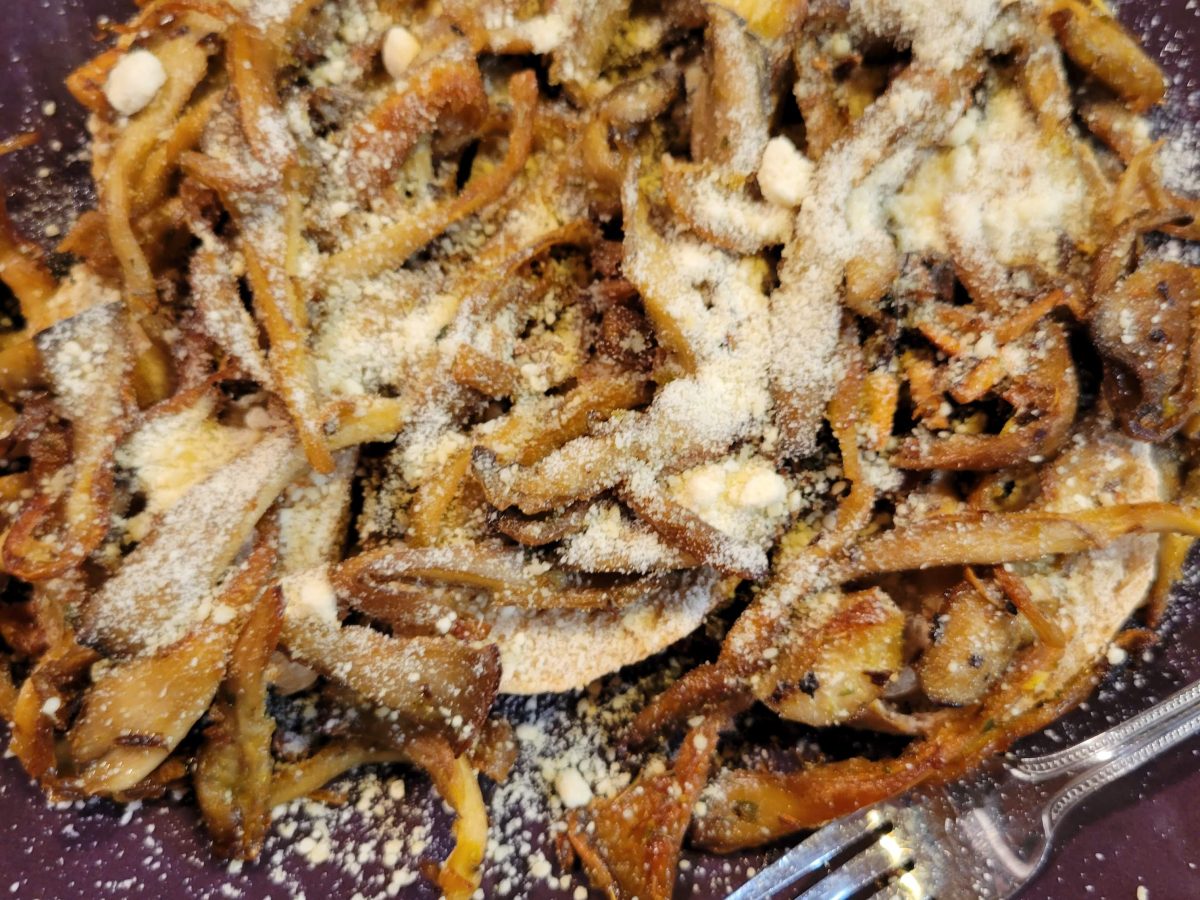 Shred the oyster mushrooms and slice or crush the garlic. In a large pan on medium heat, saute the garlic and oyster mushrooms for approximately 10 minutes. While mushroom mix cooks, toast slices of bread. Place a slice of bread on each plate, and top with oyster mushroom mix. Add parmesan cheese as desired. Enjoy!
